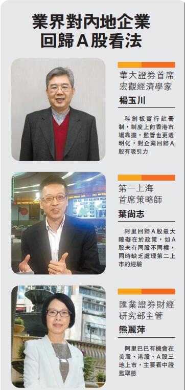 阿里巴巴之所以沒有選擇在內地第二上市,業界認為,目前紅籌回歸的主要障礙是操作細節上,如託管、定價、清算,及面值確定等,都需要細則出來才能具體操作,政策上還需要進一步放開。但亦有業界人士認為,即使紅籌回歸制度完全打通,阿里回A股也更可能是通過分拆進行,比如阿里雲等。科創板目前還不能承載體量太大的企業,但是A股市場相對高溢價的估值水平,對境外公司的回歸,長期仍具吸引力。