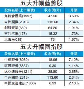 藍籌股大致造好,多隻本地地產股追落後,九倉(1997)升逾3%,領漲藍籌;新世界(017)獲高盛上調目標價4%,股價升1.3%;新地(016)也升逾1%。友邦(1299)獲大和維持「買入」評級,股價升1.5%。騰訊(700)偏軟跌0.2%。中生製藥(1177)回吐3%,為表現最差藍籌。