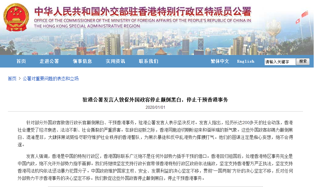 發言人強調,香港是中國的特別行政區,香港國際聯繫廣泛絕不是任何外部勢力插手干預的藉口。香港回歸祖國後,處理香港特區事務完全是中國內政,絕不允許外部勢力指手畫腳。