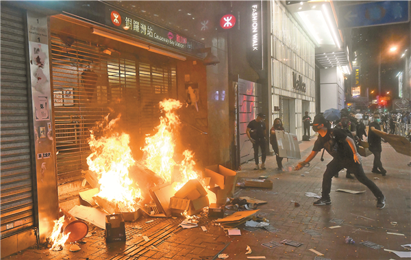 黑衣暴徒縱火燒銅鑼灣地鐵站。 記者 崔俊良攝
