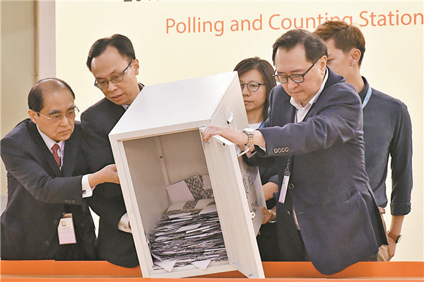 區議會選舉投票率創新高。圖為開票箱點票一刻。