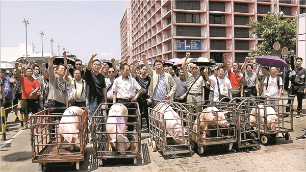 確診非洲豬瘟須銷毀豬隻,豬肉商於屠房外擺活豬抗議要求賠償。