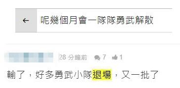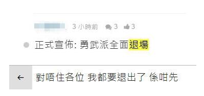 据香港新闻网报道,从7日凌晨开始,一股“悲观”情绪开始弥漫,并且迅速传遍整个社交网络——“勇武已经全面退场”。0点52分,一位疑似“勇武”在脸书发文《致呢(这)半年慨(的)手足》,他在文中宣布,正式退出“勇武派”的“火炬小队”。这只是“勇武退场”的其中一个帖子,事实上,截止到今天下午4点,暴徒聚集的“连登论坛”,一天之内关于“退场”的讨论帖就超过100篇。整个“连登论坛”,悲观气氛在弥漫……