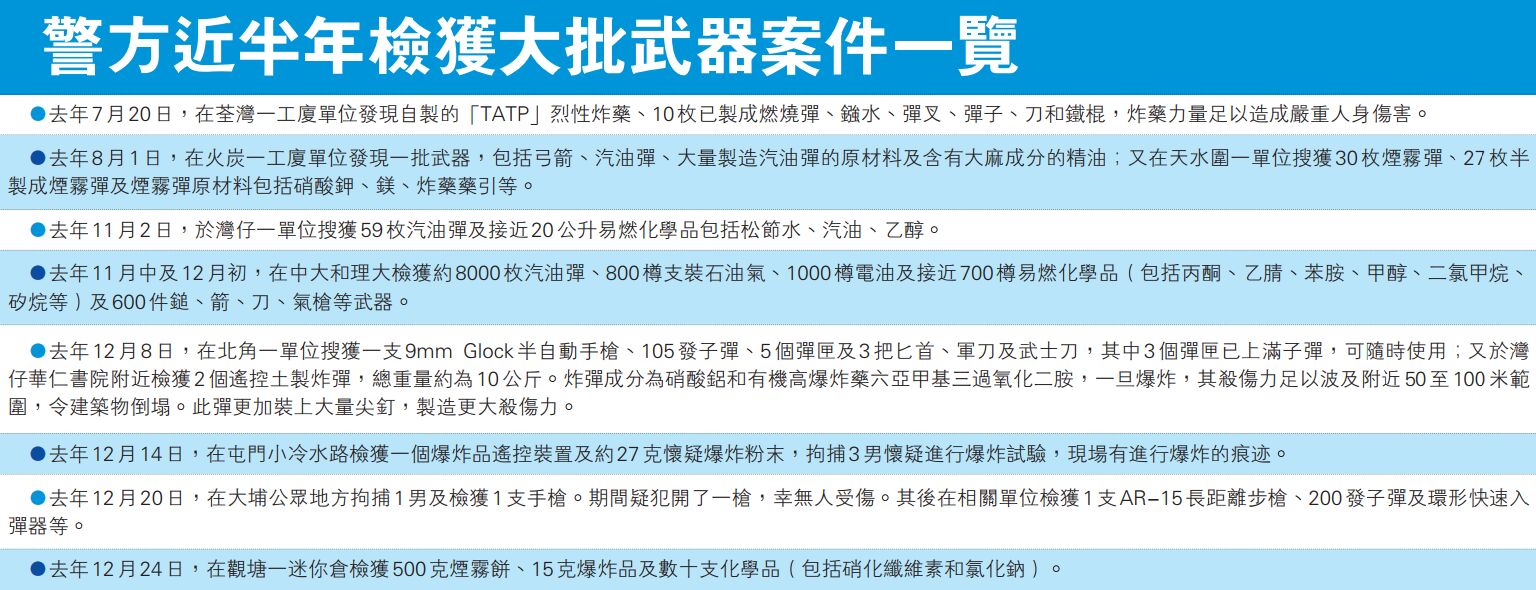 ●去年12月8日,在北角一單位搜獲一支9mm Glock半自動手槍、105發子彈、5個彈匣及3把匕首、軍刀及武士刀,其中3個彈匣已上滿子彈,可隨時使用;又於灣仔華仁書院附近檢獲2個遙控土製炸彈,總重量約為10公斤。炸彈成分為硝酸鋁和有機高爆炸藥六亞甲基三過氧化二胺,一旦爆炸,其殺傷力足以波及附近50至100米範圍,令建築物倒塌。此彈更加裝上大量尖釘,製造更大殺傷力。