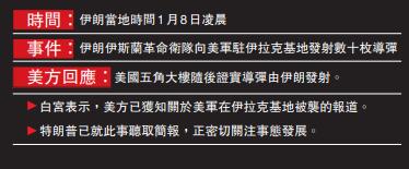 當地時間8日凌晨,作為對美軍打死伊斯蘭革命衛隊下屬「聖城旅」指揮官卡西姆.蘇萊馬尼的報復,並選擇其被美軍擊殺的時間點,伊朗向駐有美軍的至少兩個伊拉克軍事基地發射數十枚導彈,為美伊局勢再添不明朗因素。伊方聲稱,襲擊導致80名美軍死亡,約200人受傷,並摧毀大量直升機和無人機。美國防部則證實至少兩處設施遇襲,但否認有人傷亡。(相關報道刊A17版)