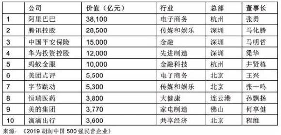 1月9日,胡润研究院发布《2019胡润中国500强民营企业》。榜单显示,阿里巴巴以3.8万亿市值位列第一,腾讯以2.9万亿市值位列第二,华为以1.2万亿市值列第四位。