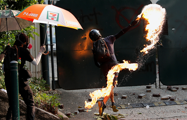 3 人涉藏汽油彈被定罪,法官明言相信汽油彈用作傷害他人,不能忽視暗藏危險,圖為暴徒投擲汽油彈的危險場面。資料圖片