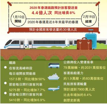 【香港商報网訊】2020年中國春運即將拉開大幕。中國國家發展和改革委員會副秘書長、新聞發言人趙辰昕昨日在北京表示,今年春運期間預測全國旅客發送量將達約30億人次,與上年大致持平,略有增長。中國民用航空局總飛行師萬向東同日透露,今年春運中國民航旅客運輸量預計達到7900萬人次,比去年增加約8.4%,創歷史新高。