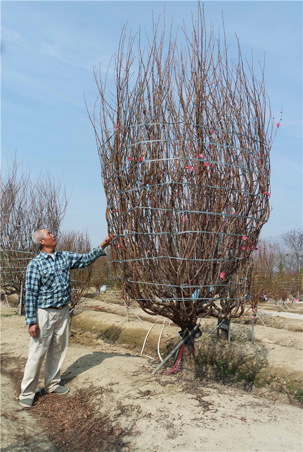 財記花園負責人郭財添悉心打理高達15呎、種植5年有多的桃花。記者 黃永佳攝