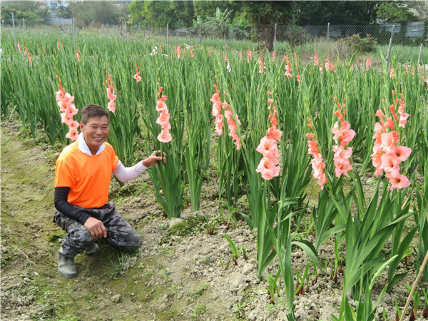 梁日信的花場有 6 至 7 萬支劍蘭及百合應市,「粉紅美人」 是新品種。記者 鄭玉君攝