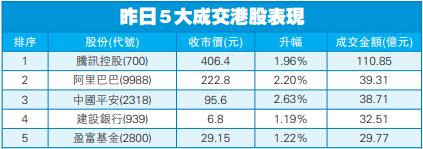 重磅股當中以騰訊(700)表現最為突出,升2%,收報406.4元,為全日最高位,更創逾一年半高,成交額達110.85億元,為成交額榜首。其他重磅藍籌,中國平安(2318)漲2.63%,報95.6港元,貢獻恒指41點;港交所(388)漲1.89%,報280.2港元,貢獻恒指19點。