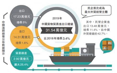 【香港商報網訊】在全球經貿風險和不確定性加劇的背景下,中國外貿繼續保持穩中提質的勢頭,2019年全年成績單靚麗。海關總署昨日公布數據顯示,去年中國外貿進出口總值31.54萬億元人民幣,同比增長3.4%,全年進出口、出口、進口均創歷史新高。值得一提的是,2019年,中國民營企業首次超過外資企業,成為最大的外貿主體。分析認為,2019年中國有望繼續保持全球貨物貿易第一大國的地位,預計2020年外貿繼續保持總體平穩增長態勢,高質量發展將邁上新的台階。