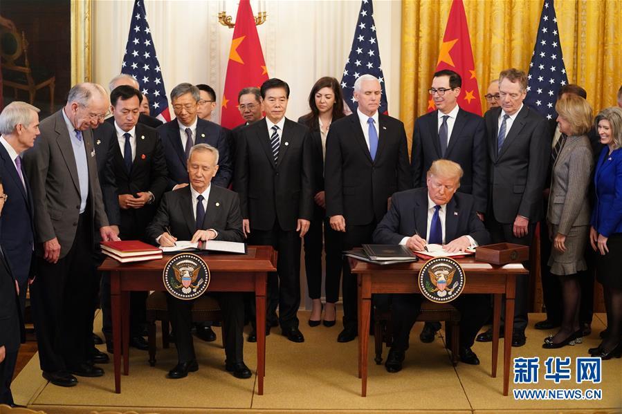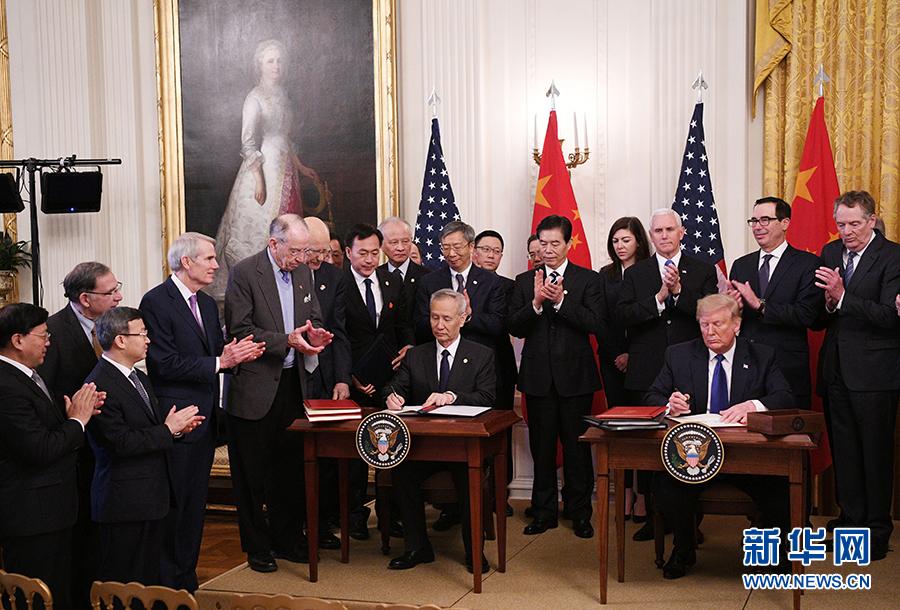 當地時間1月15日,中共中央政治局委員、國務院副總理、中美全面經濟對話中方牽頭人劉鶴與美國總統特朗普在美國首都華盛頓白宮東廳共同簽署協議文本。 當天,中美第一階段經貿協議簽署儀式在白宮東廳舉行。 新華社記者 劉傑 攝