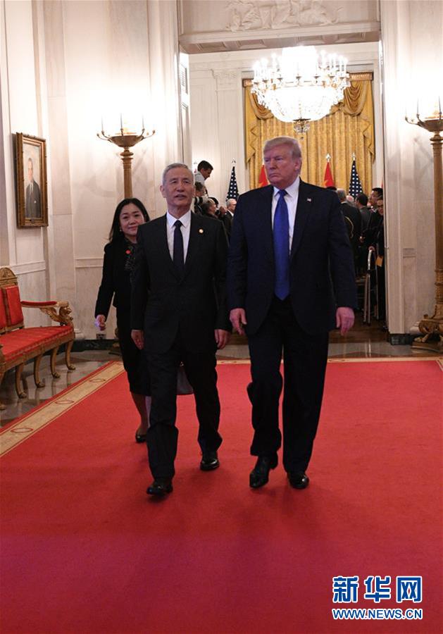 當地時間1月15日,中共中央政治局委員、國務院副總理、中美全面經濟對話中方牽頭人劉鶴與美國總統特朗普在美國首都華盛頓出席中美第一階段經貿協議簽署儀式後離開白宮東廳。當天,中美第一階段經貿協議簽署儀式在白宮東廳舉行。 新華社記者 劉傑 攝