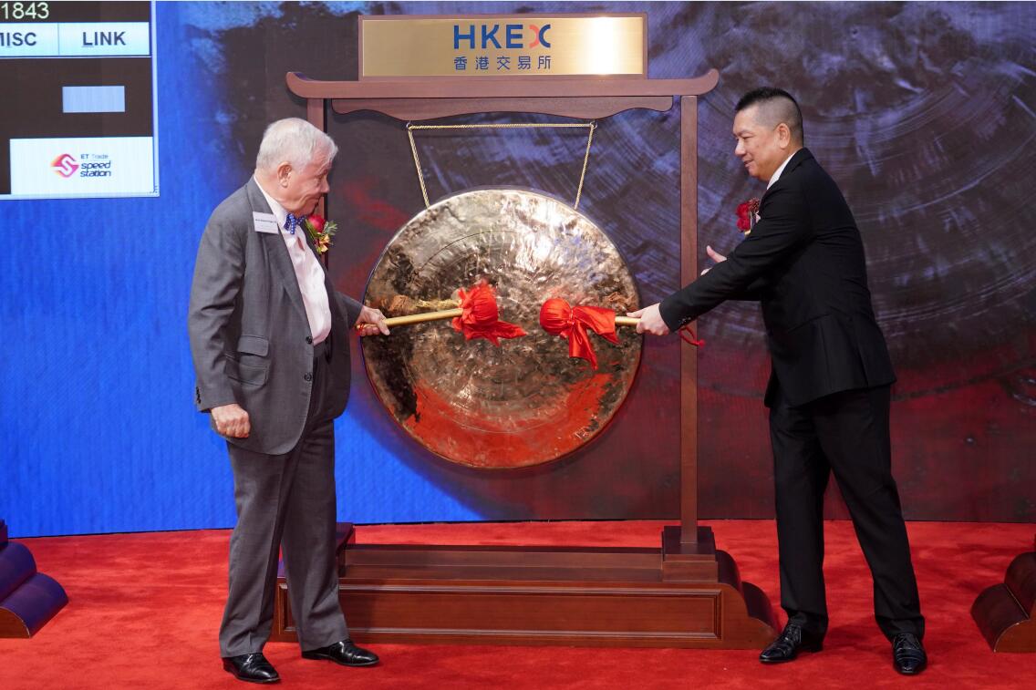 汇景控股專程請來 「商品大王」 羅傑斯(左),陪同主 席倫瑞祥敲上市銅鑼。 中通社
