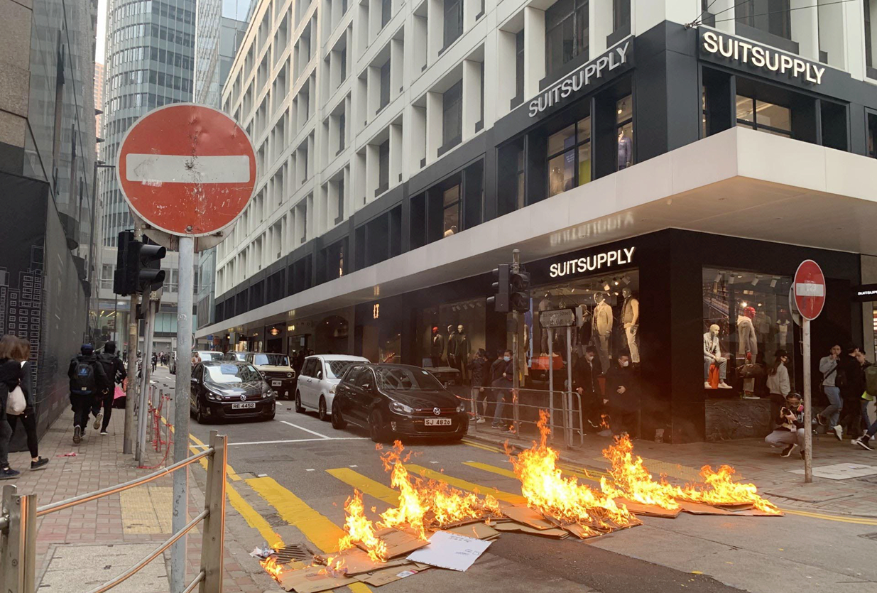 暴徒在雪廠街放火燒紙皮。網絡圖片