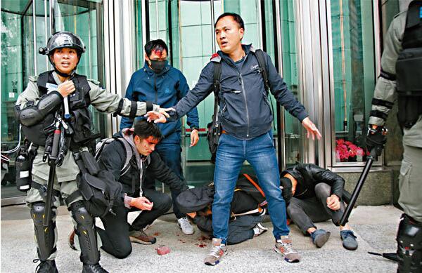 昨日,大批暴徒以木棍等武器圍毆一名警員,致其頭部流血。記者蔡啟文攝