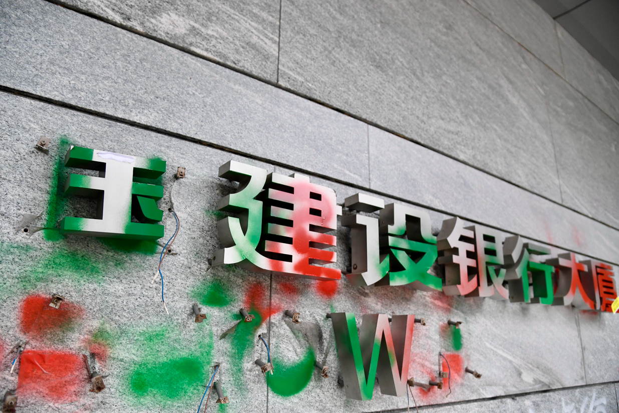 中環的中國建設銀行大廈字牌被暴徒破壞並噴污。中通社