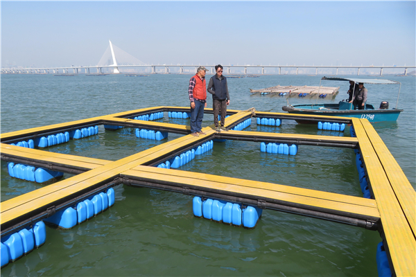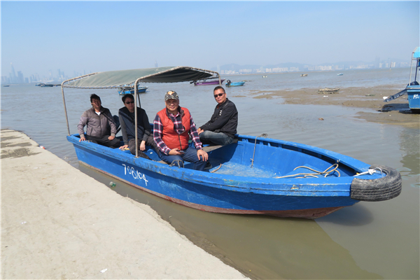 記者跟隨粵港水產科技養殖協會人員出后海灣視察蠔排情況,右二為主席陳偉強。