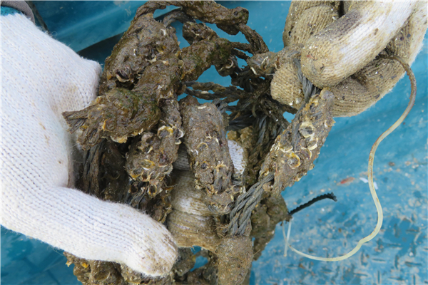 有蠔民正在培育抗鹹度高的蠔苗,蠔苗依附在麻繩上,已生長至尾指般大。
