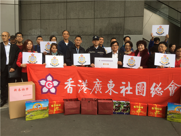 【香港商報網訊】記者馮瀚文報道:新春伊始,香港廣東社團總會及工聯會分別二十多人到灣仔警察總部慰問警察,感謝他們過去幾個月盡力維持香港治安。工聯會更送上「止暴制亂護香港,忠誠勇毅保民生」對聯。