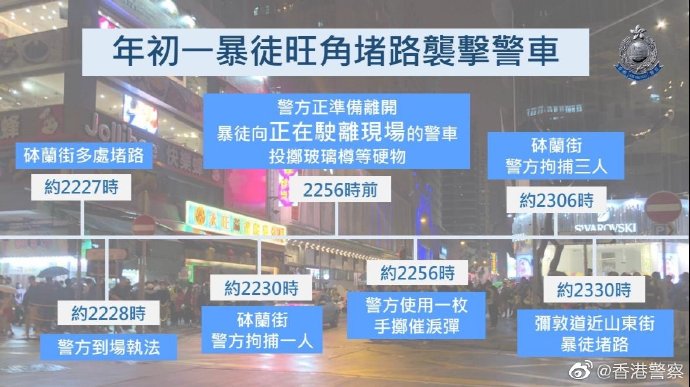 年初一晚上约十时,有蒙面暴徒集结于旺角,并以垃圾等杂物堵塞砵兰街一带的马路,引致交通受阻。警方逼不得已介入并采取执法行动,适时制止违法堵路行为。接近十一时,当警方执法后准备乘坐警车离开,暴徒竟以玻璃樽等杂物袭击。为制止暴徒的袭击,警方即时在现场施放一枚手掷催泪弹 。至十一时半左右,有暴徒冲出弥敦道近山东街的马路,并以卡板等杂物堵路,警方迅速到场执法并清理路障。