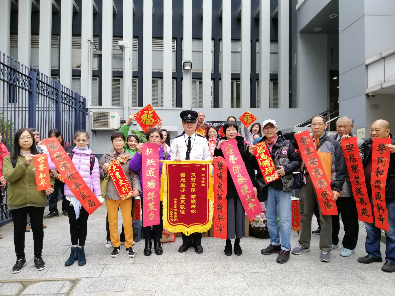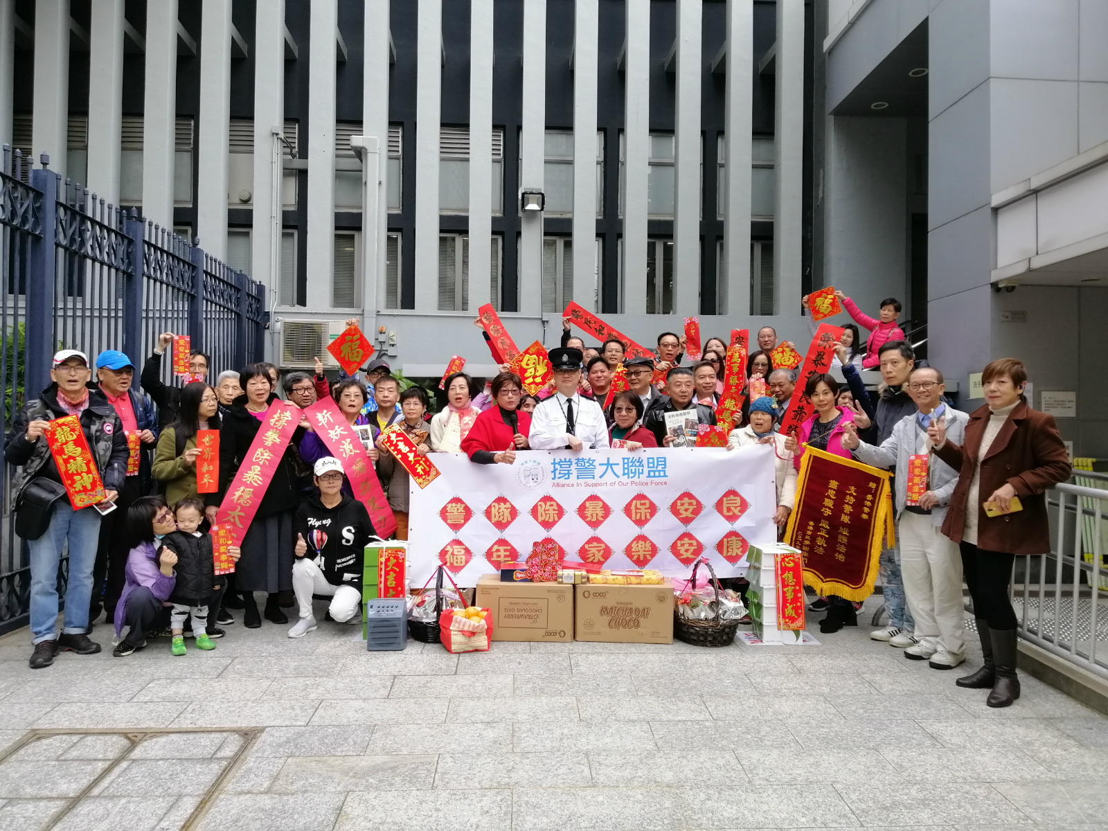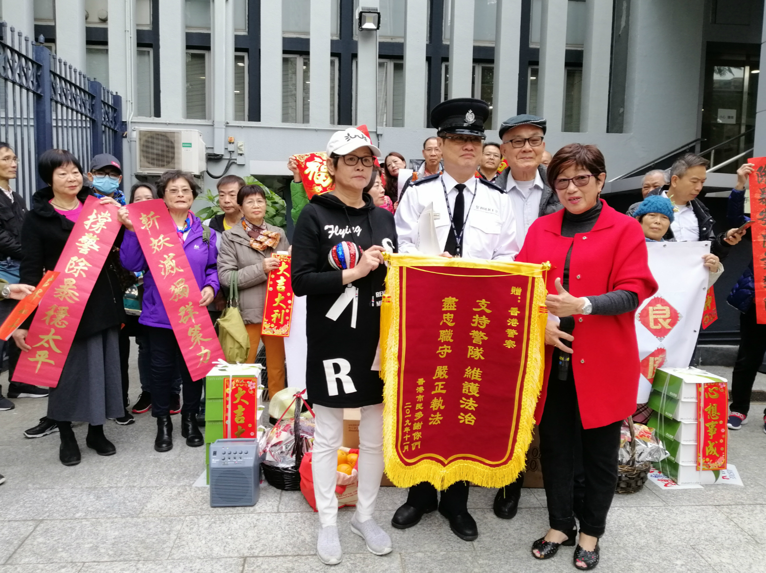【香港商报网讯】民間團體「撐警大聯盟」召集50多人於今日(27日)下午2時在黃大仙警署(沙田坳道2號) 慰問和支持警察。他们送上錦旗,生果籃、西餅和能量棒給警察加油,並祝福香港警察在新的一年龍精虎猛、萬事勝意!