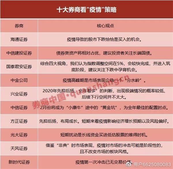 中信建投认为,从短期来看,本次疫情发生在春运时期,感染人数超出市场预期,疫情的发展也超出了市场预期,A股开市难免大幅震荡。从行业来看,航空、酒店、机场、港口、旅游、餐饮等行业受到疫情影响最为严重,但是也会成为疫情好转初期的反弹重点。与疫情相关的医药、医疗器械、防护用品类将一定程度的活跃。疫情短期会对经济产生一定的扰动,但未来国内逆周期调控政策有望进一步加码,这对市场将形成一定支撑。