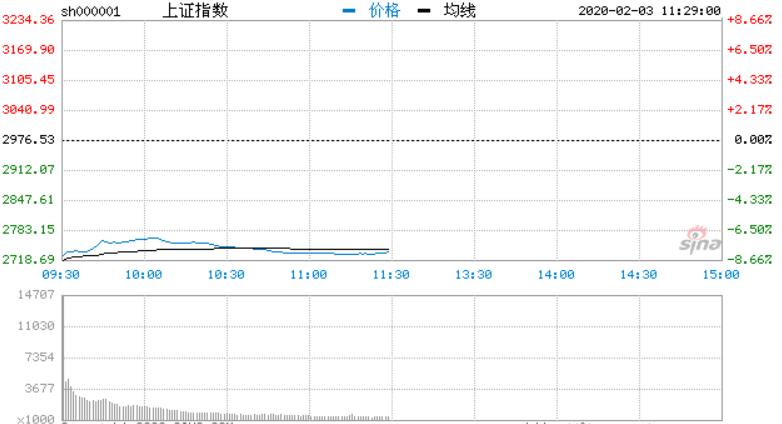 【香港商报网讯】受“新冠肺炎疫情”影响两市今日大幅低开,沪指开盘大跌8.73%,深成指跌9.13%,开盘后两市跌幅一度收窄,截至午间收盘,沪指跌8.13%,报2734.66点,深成指跌8.27%,报9798.1点,创业板指跌6.56%,报1801.28点。