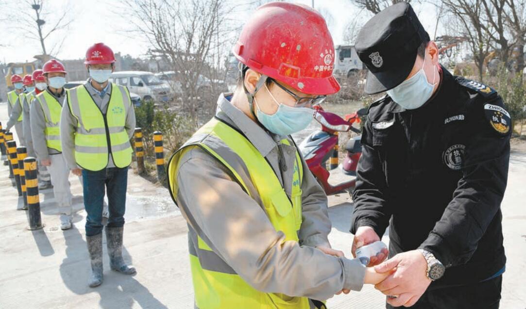 昨日,中鐵二局職工進入青島地鐵8號線工作區前間隔排隊進行體溫測量。 新華社