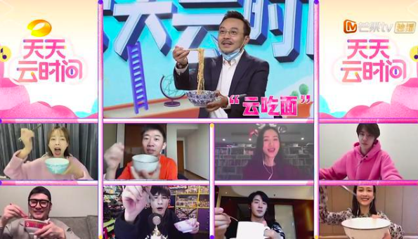 2月6日,湖南卫视《天天向上》在微博晒出录制照片,配文“正月十三,云开工”。在2月7日晚上线的第一期《天天云时间》中可以看到,节目用视频小屏拼接成电视大屏,让分散于9地的嘉宾在“云”上集合,“足不出户,节目照录”,云分享、云答题、云美食、云公益,甚至还完成了“云合唱”。