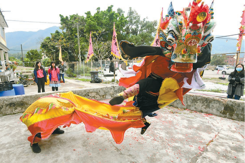 他更即席在大菴村的體育會會址前的禾堂示範參賽時高難度動作「翻簧及滾地堂」,由於舞麒麟尾的成員不是參賽時的拍檔,配合得不太好,翻了多次才像樣。比賽時他做得不夠好的動作「下中高三腳連踢」也做了,這動作非常快速,要力量夠,他說比賽時因不在最好狀態,體力不夠,踢出來效果不好。此外,也犯了露出左手的毛病。不過,在扣除犯錯分及加入難度分,在5隊參賽隊伍中,仍以0.05分險勝亞軍。