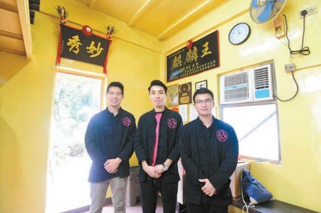 林村鄉妙秀體育會由 90後青年主理,決心承傳麒麟舞文化。左起:張育文、李浩倫、張育輝。