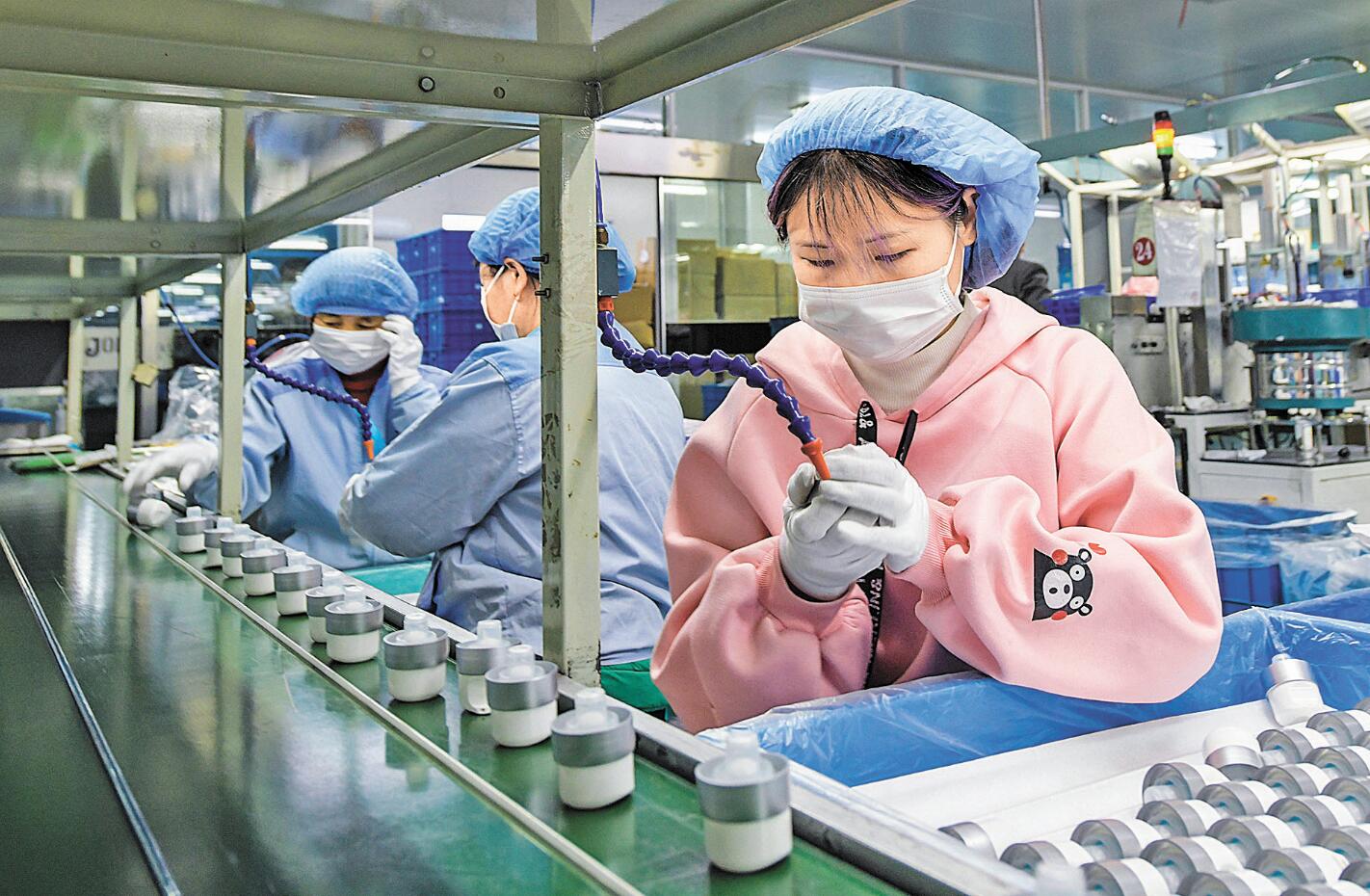 在浙江余姚市一家日用品公司的生產線上,工人們在生產塑料製品。 新華社