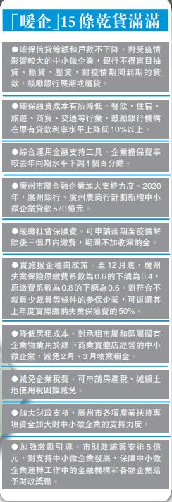 由於疫情對中小企業發展帶來的重大影響,2月7日,廣州市工業和信息化局正式發布《關於支持中小微企業在打贏疫情防控阻擊戰過程中健康發展的十五條措施》(下稱《中小微企業十五條》),從加強金融支持、降低房租成本、減免緩繳稅費、實施援企穩崗、加大財政支持、開展「暖企」行動等方面推出一批政策措施,支持廣大中小微企業穩定生產經營、實現紓難解困。該局副局長張宏偉表示,實施援企穩崗政策,預計將為企業減負約50億元,讓中小微企業享受到更多的讓利減負。