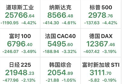 纳指、标普500指数跌势更大,标普500指数更是自去年11月以来首次跌破3000点。纳指跌幅则高达4.61%,报8566.48点。