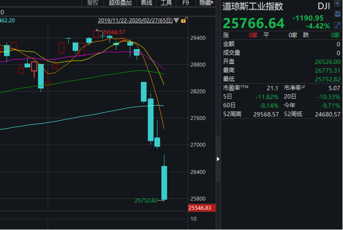 在全球新冠疫情消息冲击下,隔夜美股再次暴跌,道指再泻近1200点!