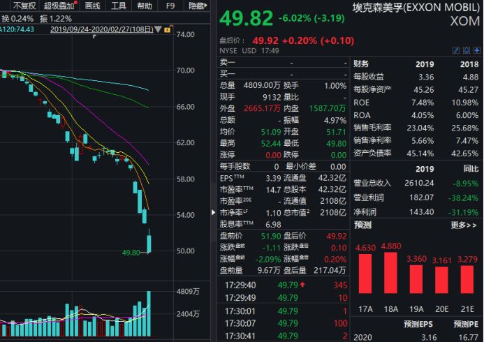 能源股多数下跌,埃克森美孚跌6.02%,该公司股价近期跌势不止,整体远远跑输美股大盘。