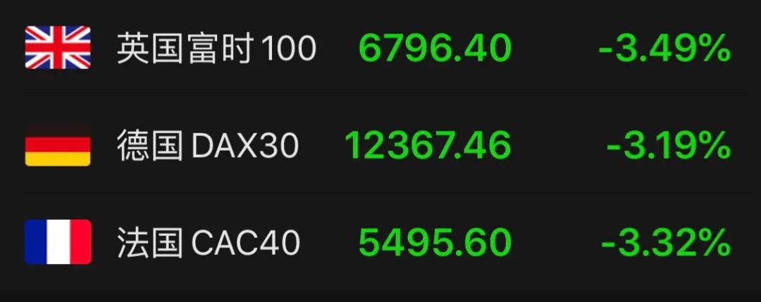法国CAC40指数跌188.95点,跌幅3.32%,报5495.60点;德国DAX指数跌407.42点,跌幅3.19%,报12367.46点。
