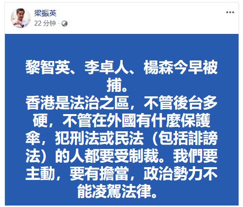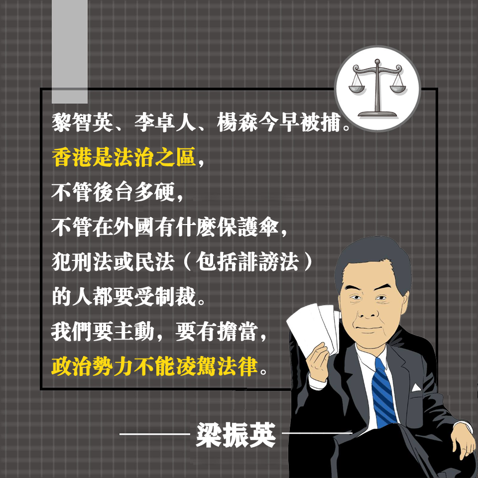 【香港商报網訊】壹傳媒創辦人黎智英、前立法會議員李卓人、何俊仁及民主黨前主席楊森今早(28日)被警方上門拘捕,涉嫌與去年831非法集會有關。全國政協副主席、香港前特首梁振英今日在社交媒體上表示,香港是法治之區,不管後台多硬,不管在外國有什麼保護傘,犯刑法或民法(包括誹謗法)的人都要受到制裁。