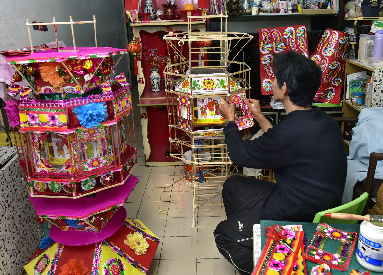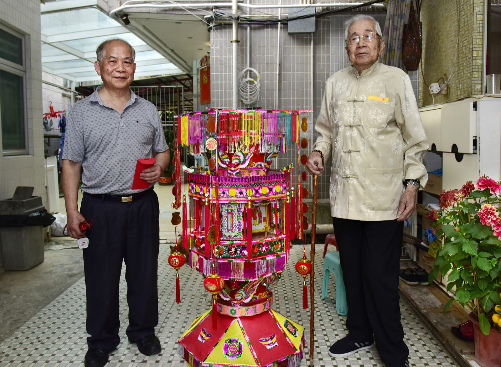 吳水勝(右)紮作客家丁燈承傳有人,楊九(左)學藝已20多年