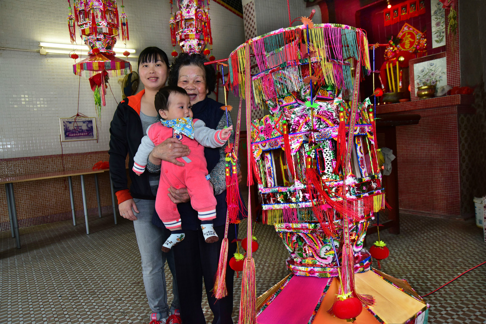 客家村民祠堂祭祖丁燈掛上俗稱帶仔的幼長花帶。