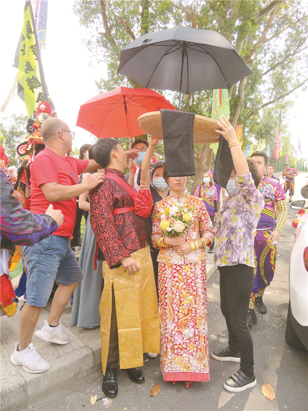 至11時,花車抵達村口,一對新人仍安坐車內。麒麟圍着花車舞動,獻上吉祥。穿上中式結婚禮服的新郎新娘其後下車,婦女們立刻將竹篩高舉在新娘頭上,像打了一把竹傘,垂下的兩條黑褲腳像兩道紗子,不時遮蓋了新娘的臉。