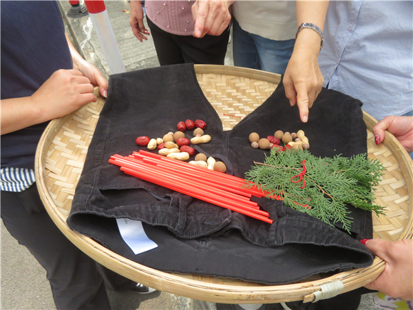 接近早上11時,馬遊塘村村口人聲鼎沸,麒麟隊整裝就緒,等候花車歸來,一些村民則在看熱鬧。這時數名婦女拿一個竹篩,內裏鋪了新娘的一條黑褲,放了些食物及植物,計有松柏一塊,花生、蓮子、紅棗及龍眼乾各十粒,還有十對筷子。綜合村代表及婦女們的解釋,是寓意新娘勤力,長壽,婚後豐衣足食,生活甜蜜,早生貴子,並愈多愈好,這種冀望早在農村年代已有,那時人力珍貴,多子女代表幸福,這傳統流傳至今。