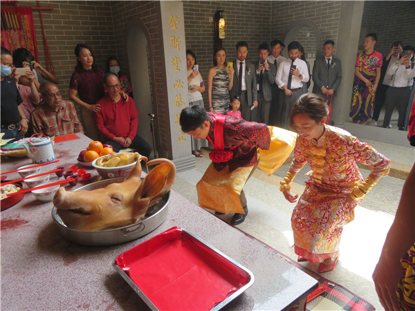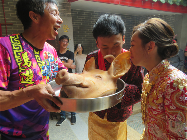 祝章宣讀後,新人上香,獻果品、糖果、雞、湯丸、豬頭豬尾,敬茶、酒、元寶。其中出現有趣環節,獻豬頭豬尾時,要新娘親親,另有新人玩夾雞蛋、銅鑼棍敲新娘頭。李健安解釋,這些都是玩新娘環節,考驗她的能力和脾氣。他說時代畢竟不同,不似從前在村中擺酒,跟住送新人入房玩新娘,就如這對新人,都是在外面擺酒,所以在儀式中加些玩新娘的玩意。