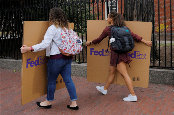 為了防止學校出現爆發性新冠肺炎疫情,哈佛大學要求學生5日內搬出宿舍,圖為學生們拿着紙箱準備打包回家。 路透社