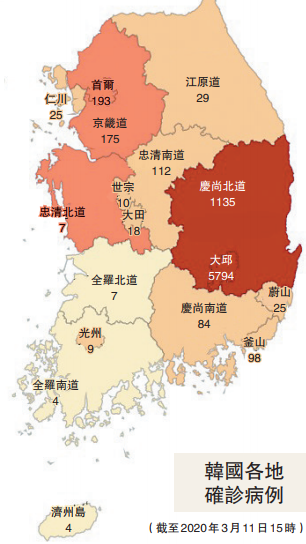 据此前消息,疫情源頭——新天地大邱教會成員主要活動的大邱市和慶尚北道仍然集中了絕大部分的病例(89.3%),兩地對新天地教徒的新冠肺炎檢測已幾近完成,超過99%的教徒均已接受檢測,在疫情中心大邱,有42.95%的新天地教徒確診新冠肺炎。
