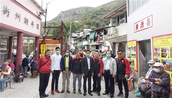新界潮人總會到深井派口罩及福米予會員,左二及右二為會董莊展銘與陳大昕,左三為常董陳義光,右四為主席莊健成,左四為深井潮僑街坊盂蘭勝會會長姚志明,餘為該會成員。