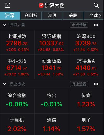 【香港商报网讯】两市集体高开,沪指涨0.25%,深成指涨0.83%,创业板指涨1.59%。盘面上看,券商、半导体板块涨幅居前,白酒板块跌幅居前。