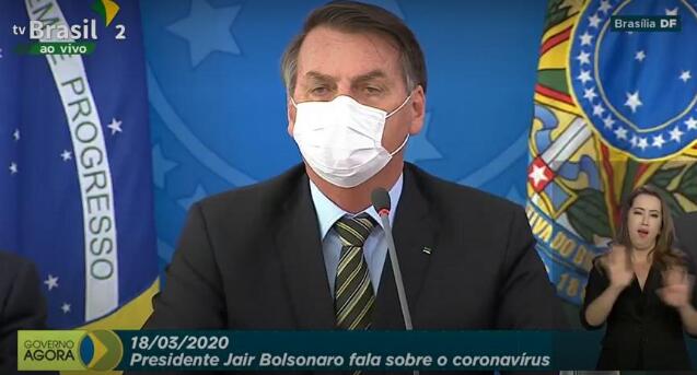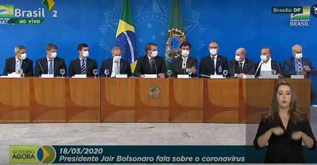 18日下午,巴西总统博索纳罗与8位部长及国家卫生监督局局长一同就政府加强针对新冠病毒的应对措施举办新闻发布会。总统博索纳罗要求议会宣布巴西进入公共灾难状态,称此举目的是保护巴西民众的健康和保障就业,并使政府可以合法地增加公共支出以应对疫情。